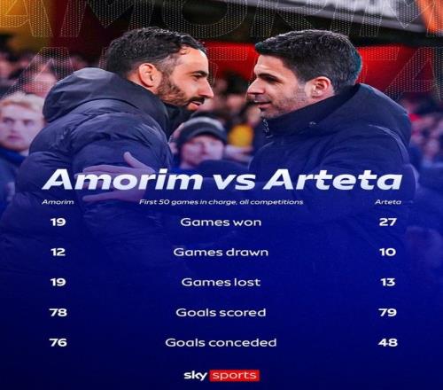 雷速体育10月11日宣 日前,曼联在英超联赛战胜桑德兰一役是阿莫林执教红魔的第50场比赛,该场胜利也稍微缓解了阿莫林的执教压力。近日,天空体育统计了阿莫林执教曼联前50场比赛与阿尔特塔执教阿森纳前50场比赛的数据情况。