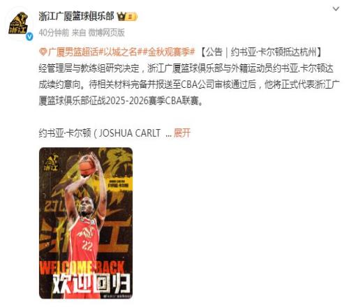 如今广厦男篮官方发布公告:“经管理层与教练组研究决定,浙江广厦篮球俱乐部与外援卡尔顿达成续约意向。待相关材料完备并报送至CBA公司审核通过后,他将正式代表浙江广厦男篮征战2025-2026赛季CBA联赛。”