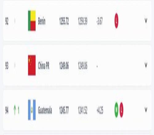 中国男足排名保持不变,仍位居第93位。