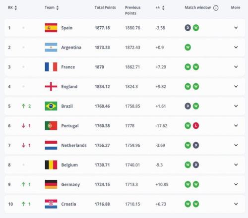 FIFA最新世界排名:西阿法英巴葡荷比德锁定世界杯种子队中国仍居第93