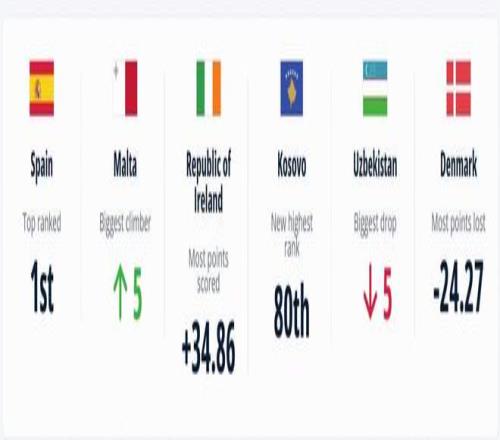 本期排名更新中,西班牙仍居首位;马耳他上升名次最多,上升5位;乌兹别克斯坦下降名次最多,下降5位。