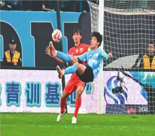 英博海发队球员朱鹏宇(前)倒钩射门。 辽宁日报记者 孙海涛 摄