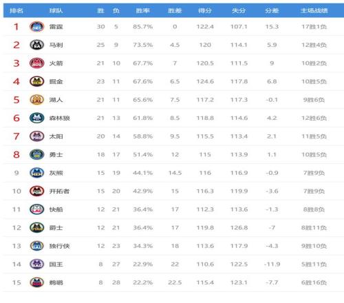 雷霆赢球后4连胜,战绩30胜5负排名联盟第一,勇士输球后18胜17负排名西部第八。