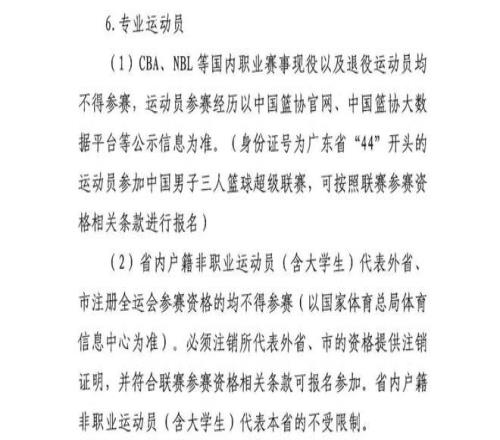(1) CBA、NBL等国内职业赛事现役以及退役运动员均不得参赛,运动员参赛经历以中国篮协官网、中国篮协大数据平台等公示信息为准。(身份证号为广东省"44"开头的运动员参加中国男子三人篮球超级联赛,可按照联赛参赛资